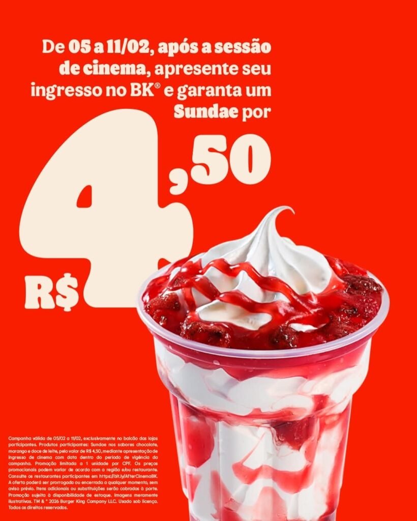 Entre os dias 05 e 11 de fevereiro, o público poderá aproveitar uma oferta especial e garantir os tradicionais Sundaes do BK® por apenas R$ 4,50, mediante apresentação do ingresso de cinema. A iniciativa conecta entretenimento e gastronomia, incentivando os consumidores a estenderem a diversão com uma sobremesa clássica da rede.