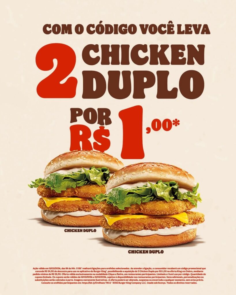 A campanha acontece apenas no dia 13 de março, entre 11h e 14h, quando o Burger King realizará ligações para telefones públicos específicos. Quem atender a chamada poderá receber um código promocional exclusivo, que desbloqueia R$ 24,90 de desconto dentro do aplicativo oficial da rede. O benefício permite utilizar a promoção “King em Dobro” para retirar dois sanduíches Chicken Duplo pagando apenas R$ 1.