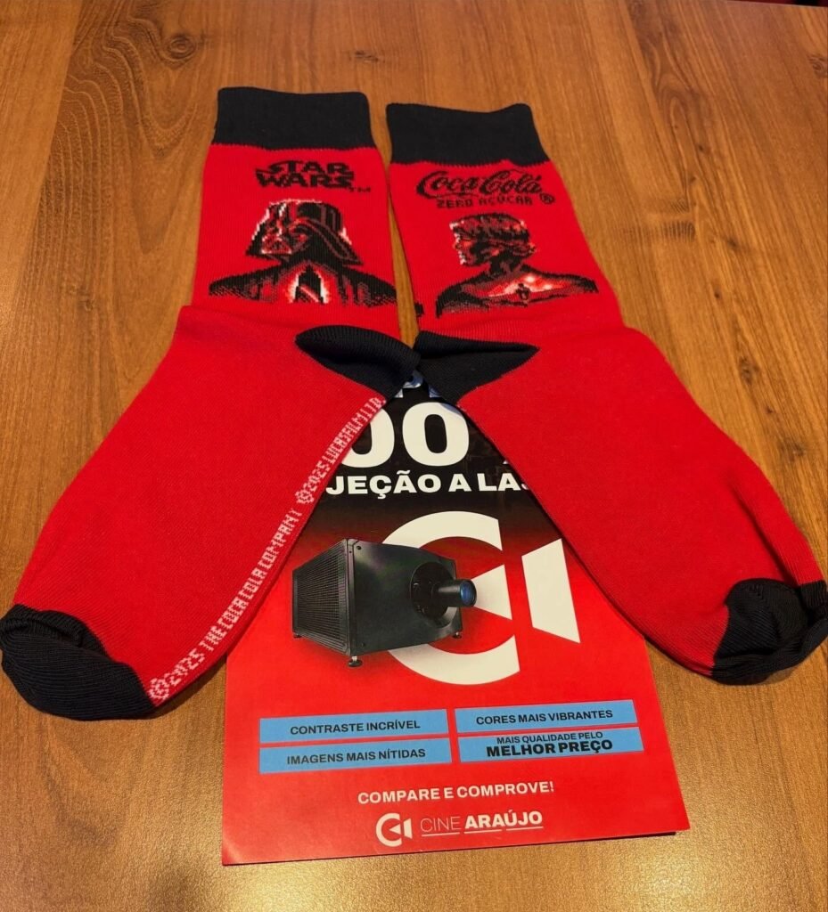 A Coca-Cola e a rede Cine Araújo uniram forças para lançar uma promoção que vai empolgar fãs de Star Wars e apaixonados por cinema: a cada combo promocional adquirido, o público ganha um par de meias temáticas inspiradas na icônica franquia. A ação, que acontece em salas selecionadas da rede, combina o melhor do entretenimento com o encanto dos brindes colecionáveis — uma verdadeira celebração da cultura pop.