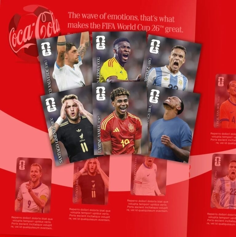 As figurinhas estarão posicionadas na parte interna dos rótulos de garrafas de 600 ml, tanto na versão tradicional quanto zero açúcar. Ao todo, serão 12 versões especiais, incluindo jogadores de seleções de destaque como Brasil, Argentina, Alemanha, Inglaterra e Estados Unidos. Entre os nomes esperados estão atletas como Lamine Yamal, Harry Kane e Joshua Kimmich, ampliando o apelo entre fãs de diferentes nacionalidades.