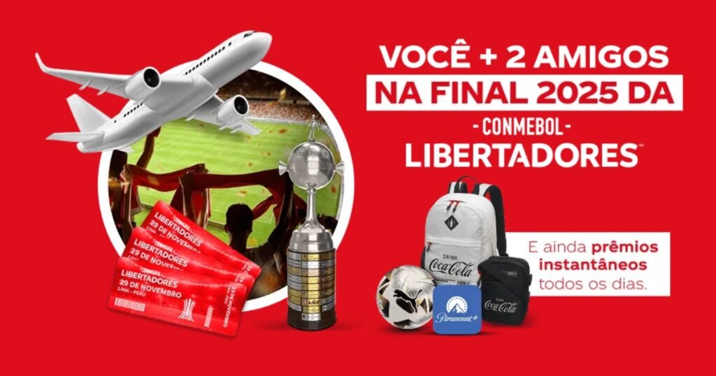 A Coca-Cola está dando mais um motivo para os fãs vibrarem junto com o futebol: a promoção Gole Premiado. Ao participar, os consumidores têm a oportunidade de ganhar prêmios na hora e ainda concorrer a uma experiência inesquecível: assistir à grande final da Copa Conmebol Libertadores 2025, em Lima, no Peru.