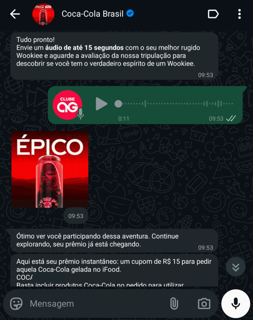 Agora, com “O Pedido Wookiee”, a Coca-Cola transforma o WhatsApp em um portal intergaláctico. Os fãs acessam o chat oficial da marca, fazem um rápido cadastro e enviam seus áudios em “Wookieês”. Um sistema de inteligência artificial analisa entonação, ritmo e sonoridade para validar o pedido, garantindo uma experiência gamificada e divertida.
