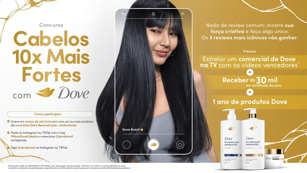 O vídeo deve ser publicado no TikTok ou Instagram, até o dia 21 de outubro de 2025, com a hashtag #NovoDoveCabelos e a marcação do perfil oficial @DoveBrasil. Vale lembrar que o perfil precisa estar público para que a participação seja válida.