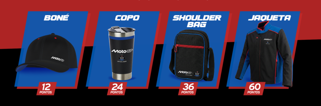 Os brindes são um verdadeiro convite ao colecionismo, todos desenvolvidos com identidade esportiva e inspiração no MotoGP. Com 12 pontos, é possível garantir um boné personalizado. Ao alcançar 24 pontos, o consumidor troca por um copo colecionável exclusivo da campanha.