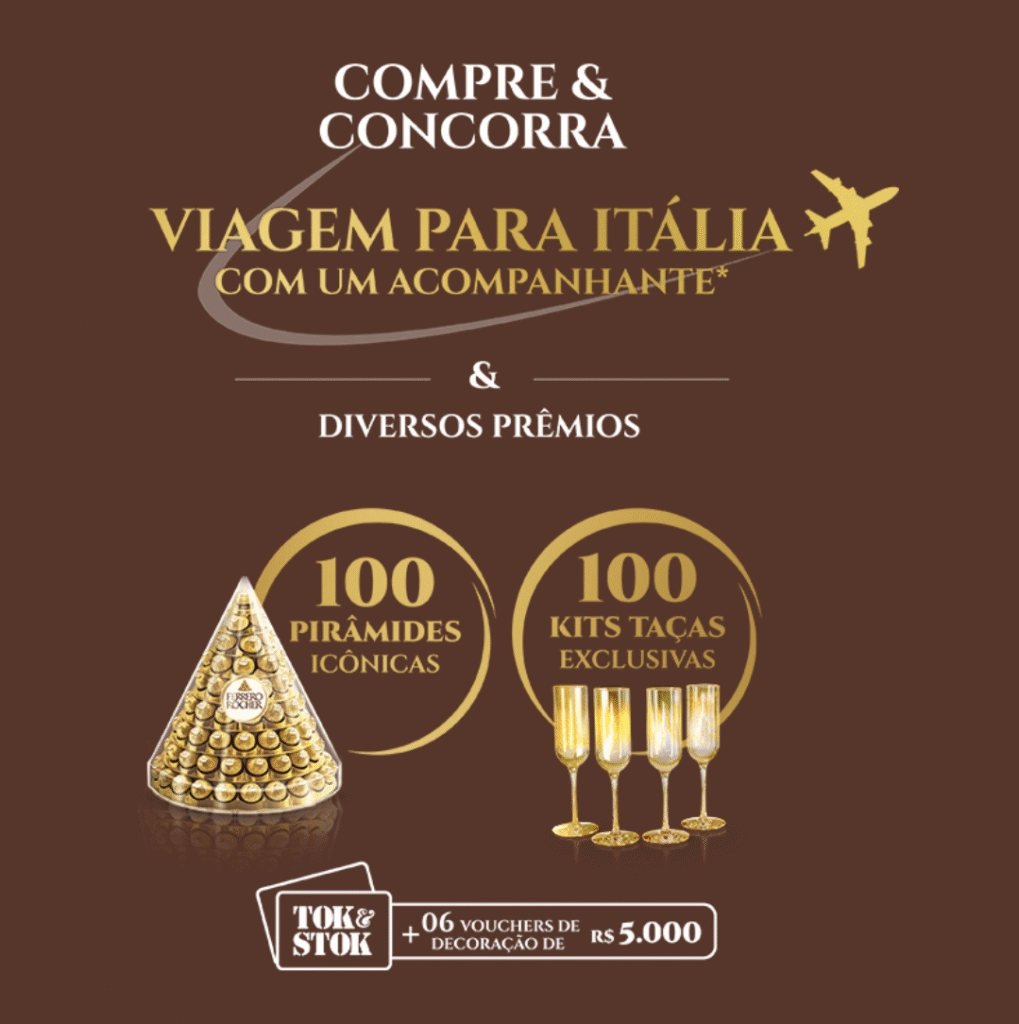 Entre os prêmios, estão 100 pirâmides icônicas com 96 bombons, 100 kits com taças de cristal personalizadas e vales Tok&Stok no valor de R$ 5 mil. Já o grande prêmio final entrega R$ 60 mil em um cartão pré-pago, um valor simbólico que remete a uma viagem de sonhos à Itália — país de origem da marca.