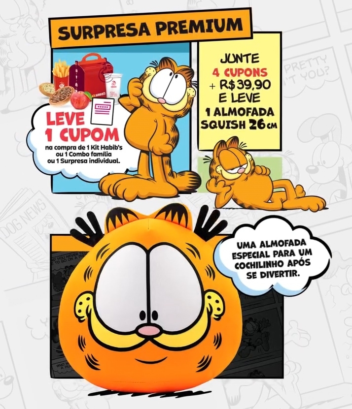 Além das luminárias, a rede estruturou uma mecânica promocional complementar para incentivar maior ticket médio. A cada compra de 1 Kit Habib’s ou Combo Família ou Surpresa individual, o cliente recebe 1 cupom promocional. Ao juntar 4 cupons e acrescentar R$ 39,90, é possível garantir uma almofada squish de 26 cm do Garfield, ampliando a experiência para além da iluminação e entrando no segmento de itens macios e colecionáveis.