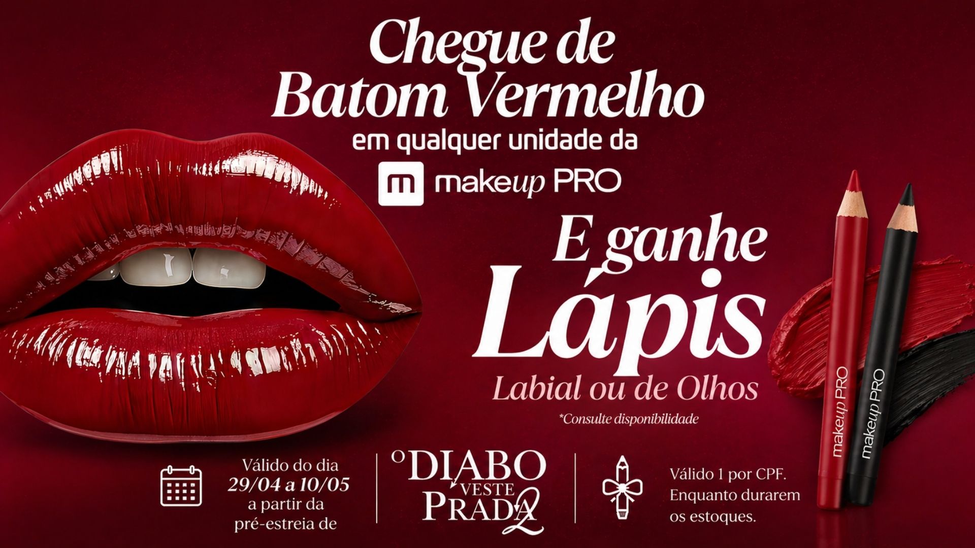 A Makeup PRO decidiu apostar em uma estratégia direta, sensorial e altamente conectada ao universo fashion para impulsionar o fluxo em suas lojas físicas. Inspirada no icônico filme O Diabo Veste Prada, a marca lançou uma ação promocional que transforma o clássico batom vermelho em um verdadeiro passaporte para ganhar brindes exclusivos. Entre os dias 29 de abril e 10 de maio, clientes que comparecerem às unidades da rede utilizando o item garantem na hora um lápis labial ou lápis de olhos, sem necessidade de sorteios ou processos complexos.