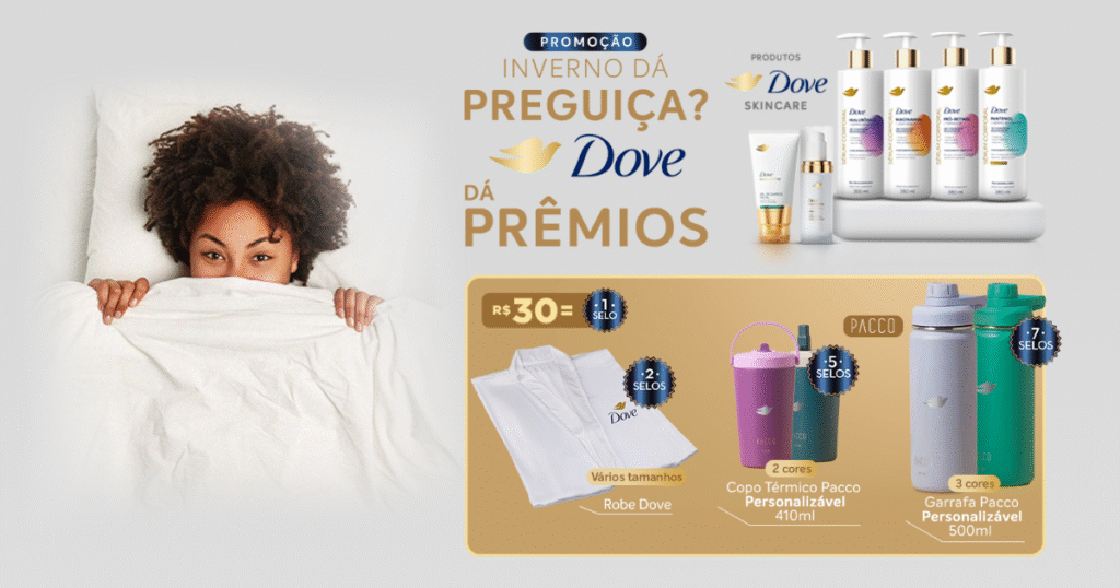 O inverno chegou, mas a Dove tem um motivo irresistível para você sair da cama: a nova promoção “Inverno dá preguiça? Dove dá prêmios!” já começou e vai transformar suas compras em recompensas exclusivas! Até 31 de agosto de 2025, comprando R$ 30 em produtos participantes da marca, você ganha selos digitais para trocar por brindes que vão deixar seus dias mais confortáveis e estilosos.