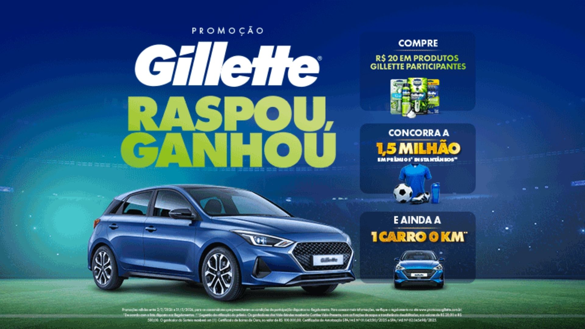 Realizada pela Procter & Gamble, detentora da marca Gillette, a campanha contempla consumidores maiores de 18 anos que adquirirem produtos participantes no período de 02 de março de 2026 a 31 de maio de 2026. Além do prêmio principal, a mecânica inclui a distribuição de 60 mil cartões vale-presente com valores que podem chegar a R$ 500, ampliando significativamente as chances de ganho.