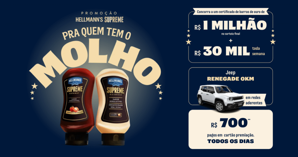 A Hellmann’s acaba de lançar mais uma super promoção para os amantes de sabor e inovação: a campanha Hellmann’s Supreme – “Pra Quem Tem o Molho”. De 25 de agosto a 25 de outubro de 2025, quem comprar produtos participantes da marca terá a chance de concorrer a prêmios instantâneos todos os dias, a sorteios semanais e ao grande prêmio final, que sorteará um Jeep Renegade 0km.