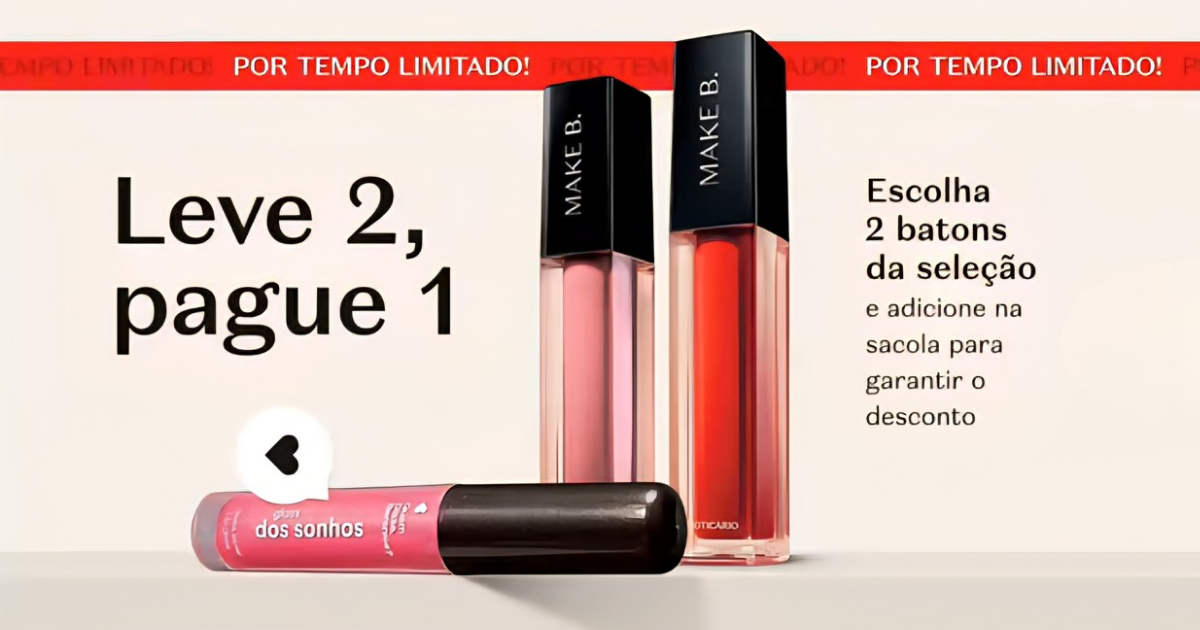 A promoção é válida para batons em diferentes acabamentos: cremosos, matte, líquidos e até gloss labial, das linhas queridinhas Make B., Volumão e Dos Sonhos. Seja para criar um look mais ousado ou destacar a beleza natural dos seus lábios, essa seleção tem tudo para te surpreender. Mas atenção: a oferta é válida somente para produtos com a etiqueta “Leve 2, Pague 1“, exclusivamente no site e aplicativo oficial de O Boticário, e sujeita à disponibilidade de estoque.