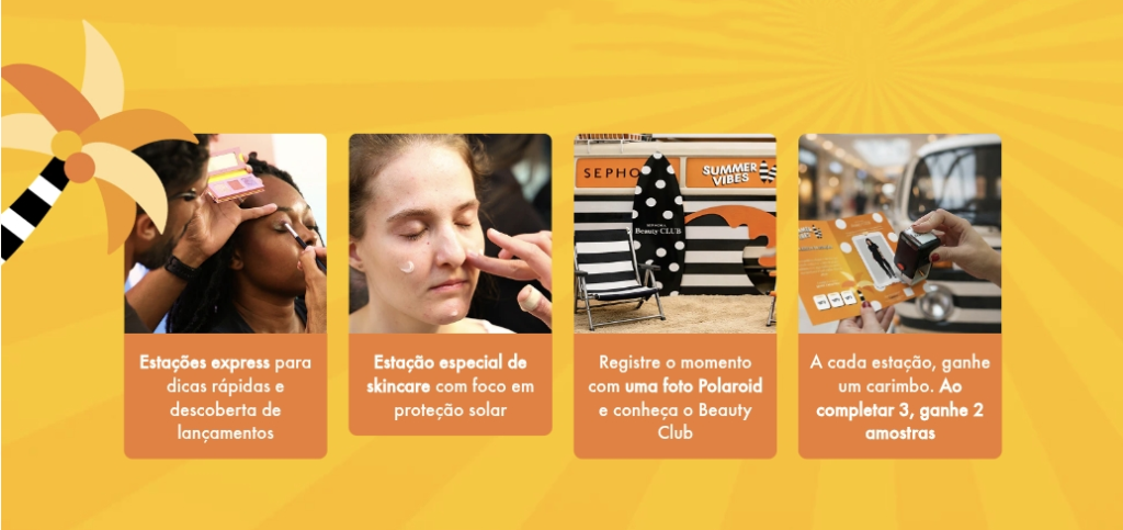 Experiências de beleza serão realizadas em estações, e ao final do circuito os participantes ganham amostras. — Reprodução: Sephora