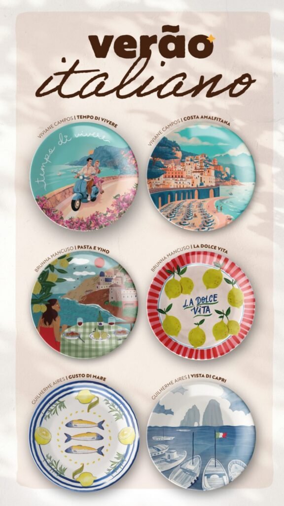 A coleção 2025 reúne obras exclusivas criadas por três artistas brasileiros que mergulharam na estética e nos sabores do verão europeu. Guilherme Aires assina os pratos “Gusto Di Mare” e “Vista Di Capri”, inspirados no mar e na culinária mediterrânea. Brunna Mancuso criou “La Dolce Vita” e “Pasta e Vino”, com um toque feminino e romântico. Já Viviane Campos dá vida a “Tempo Di Vivere” e “Costa Amalfitana”, retratando a beleza do cotidiano italiano.