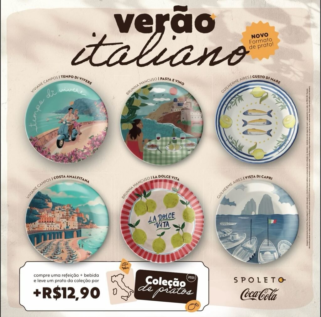 A tradicional campanha de pratos colecionáveis do Spoleto, líder de mercado e maior rede de franquias de comida italiana do Brasil, chega em 2025 com um novo tema irresistível: “Verão Italiano”. A partir de 15 de outubro, os clientes poderão conferir as 6 novas estampas que celebram o clima vibrante, leve e colorido da estação mais charmosa da Itália, disponíveis em todos os restaurantes da rede pelo país.