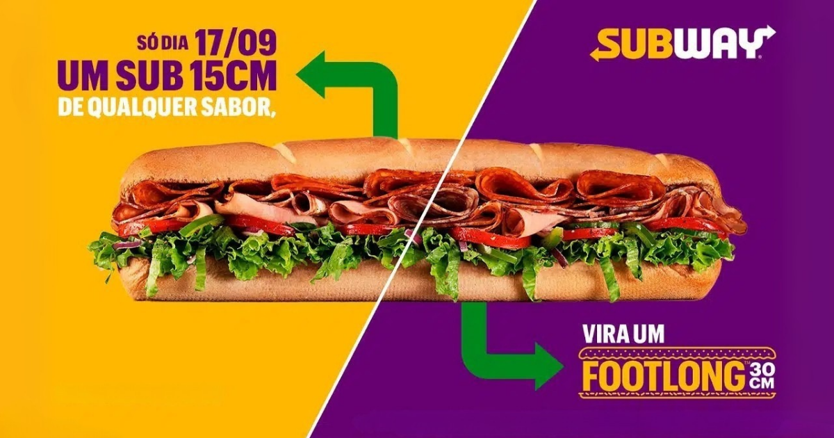 No dia 17 de setembro, qualquer sanduíche de 15cm vira um footlong de 30cm em todos os restaurantes Subway, válido uma vez por CPF, durante o Sub Day.