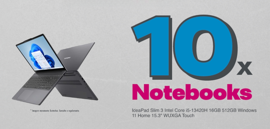A premiação é totalmente voltada à tecnologia, pensada para apoiar os estudos no dia a dia. Serão sorteados 10 Notebooks IdeaPad Slim 3, equipados com processador Intel Core i5, 16GB de memória RAM, 512GB de SSD e tela touch de 15,3 polegadas com resolução WUXGA. O valor total dos prêmios ultrapassa R$ 42 mil.